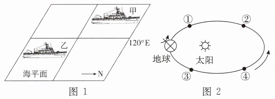 (2024·嘉兴八校联考)2024 年 5 月 20 日某时刻,在我国南海某海域有两艘均向正北方向航行的渔政船,两艘船上的中国海员同时看到太阳位于海平面上。图 1 为此时刻渔政船的地理位置示意图,图 2 为地球公转轨道示意图。据此完成第 17、18 题。