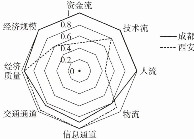 10.D【解析】与西安相比,成都在经济规模、资金流、技术流和人流方面的辐射能力都明显较强,说明成都的经济发展水平和科技水平更高,成都与重庆形成协同效应,在技术、资金和人才方面流动较快,经济辐射能力比西安强,A、B、C均不符合题意;据图可知,成都在交通通道、信息通道、物流方面比西安弱,D符合题意。