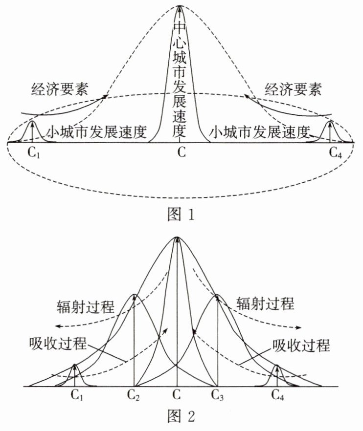 城市腹地指城市周围与城市具有紧密的经济、文化联系的毗邻地区。城市与腹地的关系可以分为吸收和辐射两种模式。一般来说,城市规模较小时以吸收腹地资源为主,城市规模较大时以辐射为主。图1为城市发展过程中的单向吸收模式示意图,图2为城市发展过程中的双向影响模式示意图,图中C、C₁、C₂、C₃、C₄表示城市。据此完成第16、17题。