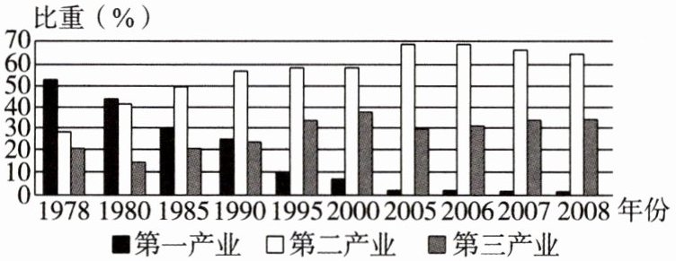 昆山产业优化和升级之路是中国经济发展的一个缩影,是苏南模式的突出代表。昆山位于江苏省东南部,东邻国际大都市上海。京沪铁路直穿开发区,从昆山乘高铁至上海仅需约25分钟。如图所示为昆山市1978—2008年产业结构变化图。