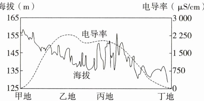 13. 丁地土壤盐碱化程度较低的原因最可能是( )