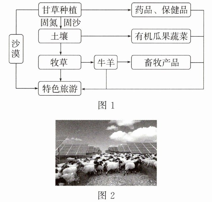 内蒙古磴口县地处乌兰布和沙漠东部边缘,在多年治沙的背景下,成功建成了一个集光伏发电、设施农业、生态旅游于一体的治沙产业园。图1为生态治沙模式示意图,图2为“光伏板上发电,板下种草,板间养羊”的生态农业景观图。据此完成第7、8题。