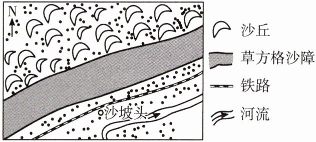 草方格沙障是一种防风固沙、涵养水分的工程措施,用麦草、稻草、芦苇等材料扎入沙丘中形成1米×1米左右的方格网。如图所示为宁夏回族自治区沙坡头草方格沙障示意图。据此完成第9、10题。