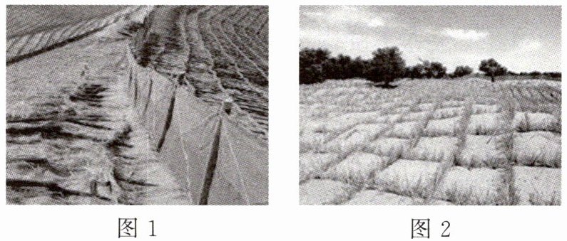 戈壁又称砾漠,是砾石和粗沙覆盖在土层上的一种地表类型。戈壁地区在铁路施工过程中,路基土石方经常就地取材,在施工完成后需要对铁路沿线和取土场采取固沙措施。图1为高立式沙障,图2为格状沙障,二者经常被用于戈壁铁路路基防沙。据此完成第16、17题。
