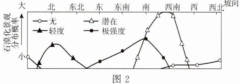 石漠化景观是喀斯特地区环境恶化最直接的标志。图1为不同坡度石漠化景观分布统计图,图2为不同坡向石漠化景观分布统计图。据此完成第14、15题。