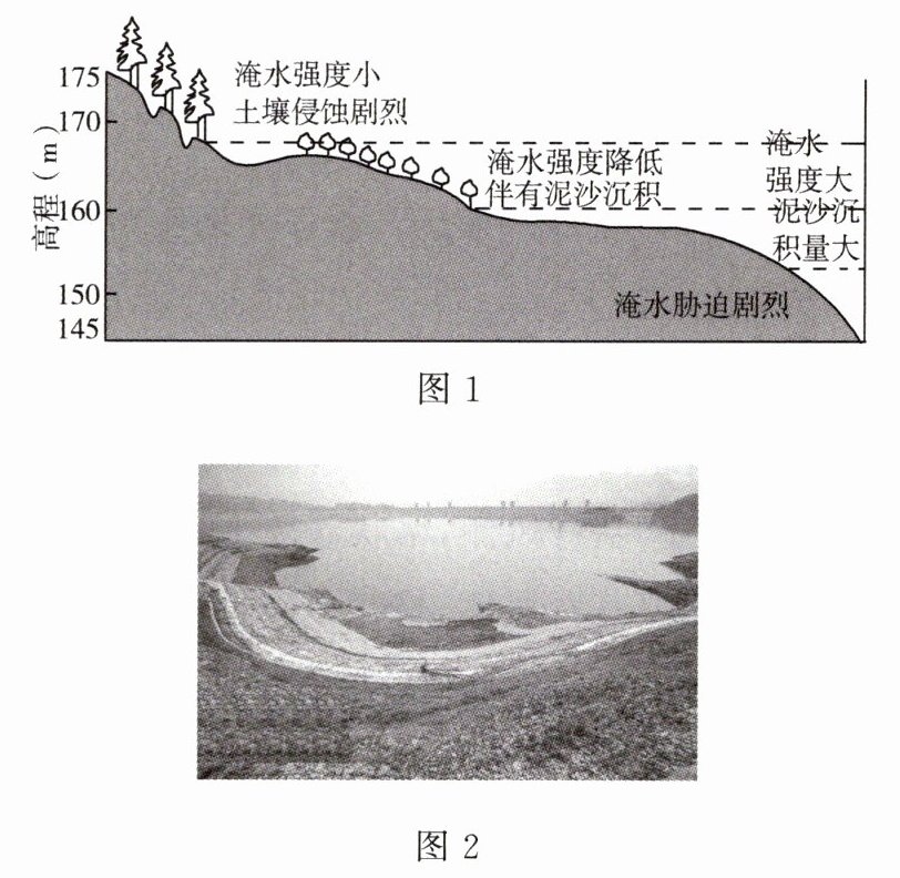 20.B 【解析】水库消落带地表基岩裸露的区域很小,大部分或有泥沙沉积或有植被覆盖,A错误;消落带水位反复涨落,水涨时水浸泡、浪侵蚀,水落时地表径流侵蚀,水土流失严重,B正确;水库消落带农业活动较少,C错误;库区在选址时应选择地质稳定、地壳运动微弱的地带,以保证水库安全,D错误。 21.A 【解析】淹水胁迫剧烈区在消落带底部,受水体淹没时间最长,宜采用自然恢复水生植物为主的策略,A正确;淹水强度大的区域不宜大量种植乔木,乔木对光照、氧气等需求大,不易繁育存活,B错误;淹水强度降低区宜选用本地物种进行生态修复,引进外来物种存在适应性问题和入侵风险问题,C错误;淹水强度小区宜选用陆生植物固定坡面,减少土壤侵蚀,D错误。
