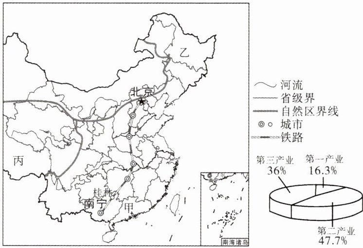 如图所示为我国部分区域图和广西壮族自治区某年三次产业结构图。