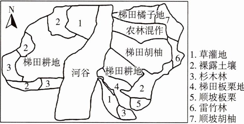 (2024·嘉兴平湖联考)如图所示为我国某地小流域土地利用示意图。该地四季分明,雨量充沛,地形以丘陵为主,河谷两侧为坡地,坡度多为15°—20°,海拔为20—50米。据此完成第16、17题。