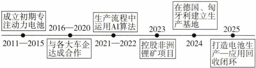 (2025·杭州高二模拟)成立于中国福建省宁德市的某新能源公司是全球领先的动力电池制造商,下图为该企业发展历史示意图。目前,该公司在全球已布局六大研发中心(五个位于国内,一个位于德国)和十三大生产基地(十一个位于国内,一个位于德国,一个位于匈牙利)。据此完成第 6、7 题。