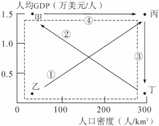 19.B【解析】据图可知,甲国人均GDP高,人口密度小,应为澳大利亚;乙国人口密度小,人均GDP低,应为索马里;丙国人均GDP高,人口密度大,应为日本;丁国人口密度大,人均GDP低,应为印度,B正确。