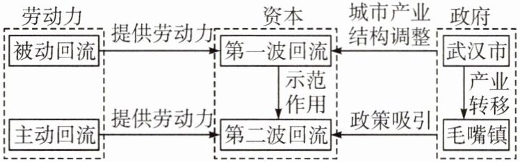 15.C【解析】据图分析,武汉进行产业结构调整,产业转出,在第一波回流的示范作用下,加上毛嘴镇的政策优势,吸引了更多企业转入,当地就业机会增加,从而吸引劳动力主动回流,C正确。