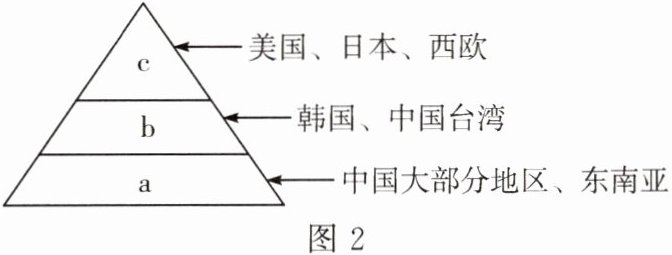 17.B【解析】据图可知,a环节处于金字塔的底层,是加工和组装环节,因为中国大部分地区和东南亚有丰富和廉价的劳动力;b是制造和生产环节;c环节处于“金字塔”的顶端,应是最核心的环节,美国、日本和西欧是经济发达地区,他们拥有品牌和核心技术,B正确。