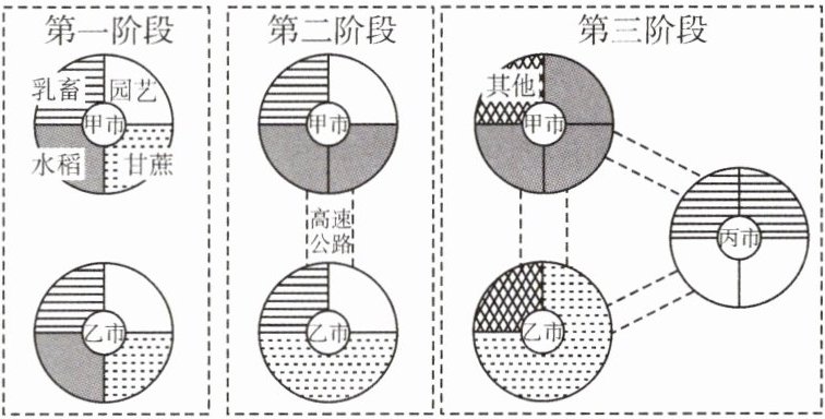 18.C 【解析】据图可知,甲、乙城市的农业类型减少,部分作物的生产规模扩大,说明出现了明显的农业专业化趋势,更利于机械化操作,使其农业生产效率提高,C正确。