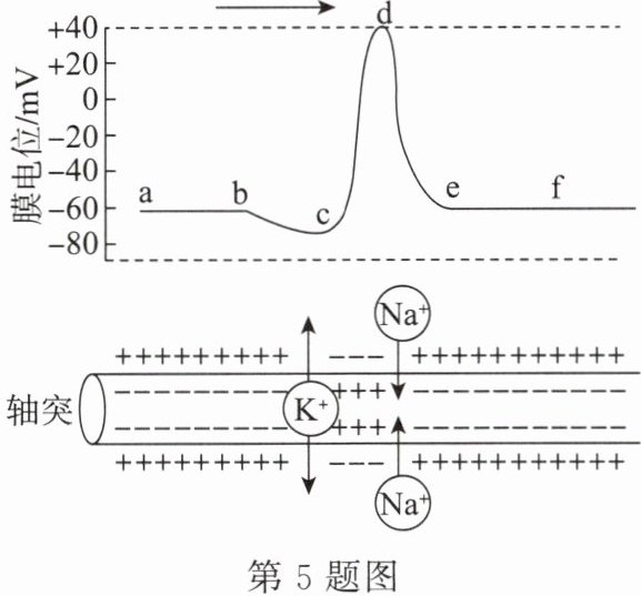 5.B 【解析】c 点为超极化状态,A 错误;图中的兴奋从左向右传递,a、b、c 处已发生过动作电位,B 正确;在 de 段,Na⁺内流,神经纤维膜正处于去极化的过程,C 错误;在 d 点,动作电位达到最大值,此时细胞膜内侧的 Na⁺浓度仍然比外侧低,D 错误。