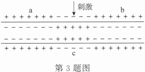 3.A 【解析】兴奋在离体神经纤维上双向传导,传导方向为 a←c→b,A 错误;兴奋在神经纤维上以电信号形式进行传导,B 正确;a、b 点未受刺激,呈静息状态,膜对 K⁺通透性大,K⁺外流,形成外正内负的电荷分布状况,C 正确;兴奋的传导方向与膜内局部电流的方向相同,D 正确。