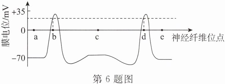 6.B 【解析】由于兴奋在离体神经纤维上双向传导,b、d 两点膜电位表现为动作电位,所以 c 点是受刺激的位点,A 正确;未受刺激时,各电表测得的数值为负数,而静息电位是外正内负,故电表的两接线柱分别接在神经纤维膜内、外两侧,B 错误;该图能体现动作电位数值大小不变,该图不能说明其传导具有不衰减性,缺少受刺激点的电位波形图,不能比较是否衰减,C 正确;图中 b 点正发生 Na⁺内流,产生动作电位,d 点表示恢复静息电位,正在发生 K⁺外流,D 正确。