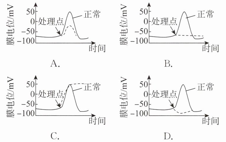 9.C 【解析】利用药物阻断 K⁺通道,静息电位的恢复受阻,但不影响动作电位产生,故药物处理后,静息电位不能恢复正常,图 C 符合题意。