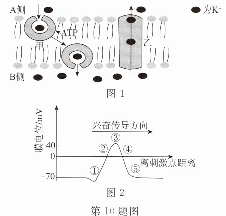 10. 如图 1 所示为神经纤维在静息和兴奋状态下 $ K^+ $ 跨膜运输的过程,其中甲为某种载体蛋白,乙为通道蛋白,该通道蛋白是横跨细胞膜的亲水性通道。如图 2 所示为兴奋在神经纤维上的传导过程。下列分析中,正确的是( )