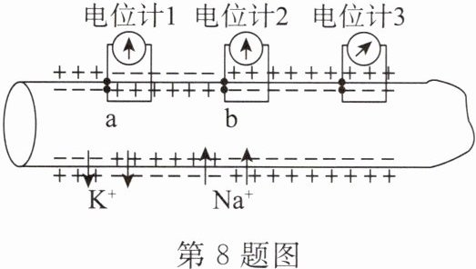 8. 神经纤维上某处受到适宜刺激后产生一个动作电位(时间为 $ m $ 毫秒),并发生传导,若某一时刻膜电位的状态(电位计 1、电位计 2 分别接在 $ a $、$ b $ 处)以及引起电位变化的 $ K^+ $、$ Na^+ $ 流向如图所示,下列叙述中,正确的是( )