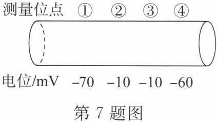 7.B 【解析】①处为静息电位,可能正处于静息状态或刚恢复静息状态,②③④都可能处于动作电位形成过程或静息电位恢复过程,所以刺激点可能位于①的左侧、④的右侧或②③之间,A 正确;③处可能处于动作电位形成过程或静息电位恢复过程,如果③处于恢复静息电位的某一点,此时③处的膜上 K⁺通道打开,K⁺外流,B 错误;动作电位沿着神经纤维传导时,其电位变化总是一样的,不会随传导距离的增加而衰减,所以动作电位沿神经纤维传导时,波幅一直稳定不变,C 正确;由静息电位值为 -70 mV 可知,测得图中①~④处膜电位的灵敏电位计,其一极接在神经纤维膜内,另一极接在膜外,D 正确。