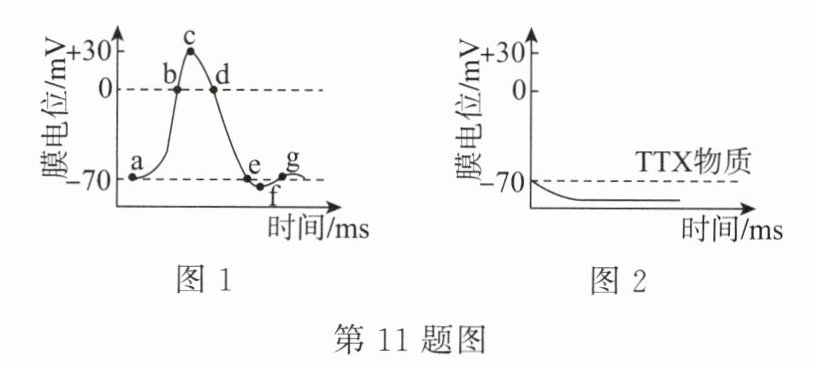 11. 如图 1 所示为某神经纤维受刺激后膜电位变化的过程,如图 2 所示为用 $ TTX $ 物质处理受刺激的神经细胞后,得到的膜电位变化。请回答下列问题: