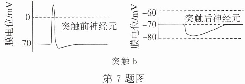 7.C [解析]静息状态下膜两侧产生70mV左右的电位差的原因是K⁺离子外流,A错误;刺激后突触a的突触后神经元膜电位仍然表现为外正内负,没有产生动作电位,B错误;刺激后突触b的突触前神经元可产生动作电位,但其释放的神经递质抑制突触后神经元兴奋,说明突触b的突触前神经元与抑制性中间神经元类似,C正确;神经递质通过胞吐进入突触间隙,而不是通过主动转运,D错误。
