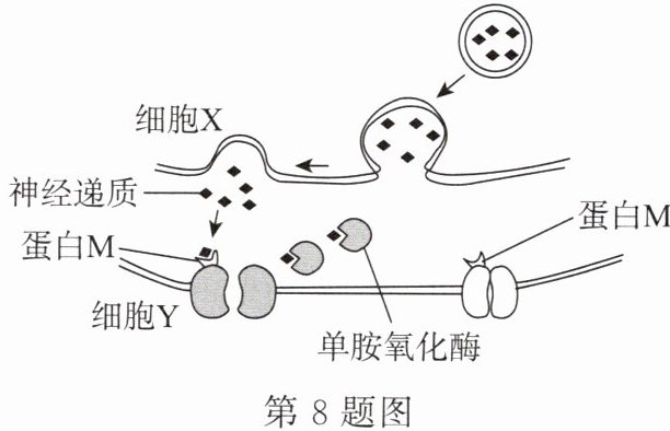 8. 研究表明,抑郁症与单胺类递质传递功能下降相关。图中的神经递质表示单胺类递质,蛋白 M 是受体。单胺氧化酶是一种单胺类递质的降解酶,其抑制剂(MAOID)是一种常用的抗抑郁药,能够抑制单胺氧化酶的活性。据图分析,下列叙述中,错误的是( )