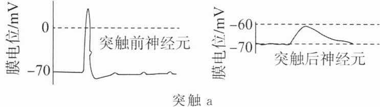 7. (2025·金华高二期末)研究人员对突触 a、b 的突触前神经元给予相同的电刺激,通过微电极测量两突触前、后神经元的电位变化,结果如图所示。下列分析中,合理的是( )
