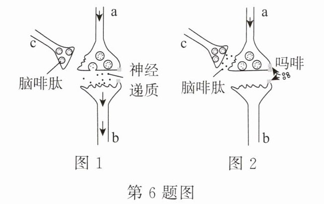 6. 吗啡与脑内的神经递质脑啡肽都能参与痛觉调节且具有镇痛作用。如图 1 所示为痛觉传入示意图,如图 2 所示为注射吗啡后痛觉调节示意图,a、b、c 表示相关的神经元。下列叙述中,错误的是( )