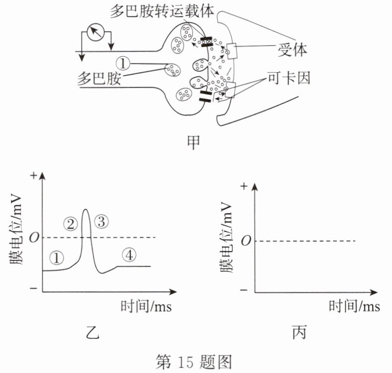 (3)K⁺外流是神经细胞产生和维持静息电位的主要原因,图乙中的①和④代表神经细胞处于静息电位,③代表神经细胞逐渐恢复静息电位,而②代表神经细胞兴奋时Na⁺内流,因此K⁺通道阻滞剂主要影响图乙中的①③④阶段。