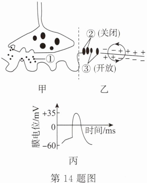 14. 如图所示,甲、乙、丙依次表示神经细胞间的某结构、兴奋在神经细胞膜上的传导和神经细胞兴奋部位膜电位的变化。请据图回答下列问题:
