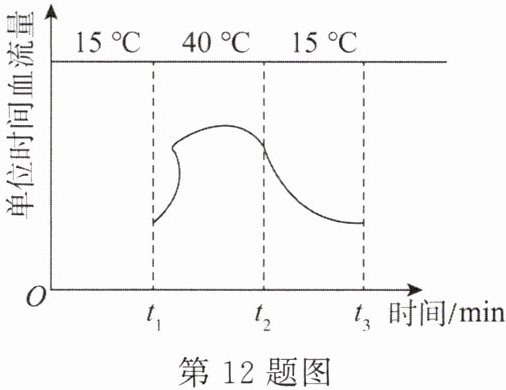 12. 如图所示为某人在安静状态时,单位时间内流经其单位面积皮肤血管的血液相对流量。在 t₁ 时刻,室内温度由 15℃突然升至 40℃,在 t₂ 时刻,室内温度又突然降至 15℃,下列说法中,正确的是( )