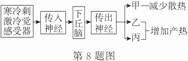 8.C【解析】不同温度刺激不同的温度感受器,使毛细血管收缩或扩张,因为反射弧不同,所以感受器不同,A错误;甲的含义是汗腺分泌减少、毛细血管收缩,减少散热,B错误;如果乙表示激素的作用,可以是肾上腺素,肾上腺素可以加快细胞代谢,增加产热,C正确;体温一直维持在37℃左右,则此时其体内产热量等于散热量,D错误。