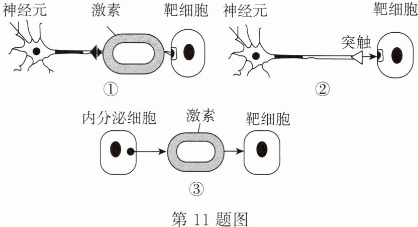 11. 如图所示,①~③是机体生理调节的三种方式,下列叙述中,错误的是( )