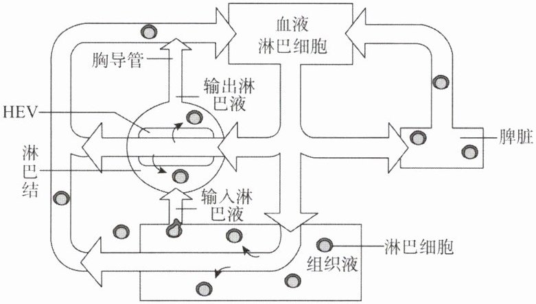 (2)胸腺是T淋巴细胞分化、发育、成熟的场所。由此可推知:骨髓中的一部分淋巴干细胞进入胸腺继续分化、增殖、发育为成熟的细胞毒性T淋巴细胞和辅助性T淋巴细胞,然后被释放到血液中。题图显示出淋巴细胞由血管进入淋巴结有两个途径:①通过毛细血管壁进入组织液后输入淋巴液到淋巴结;②通过HEV(高内皮细胞)直接进入淋巴结。