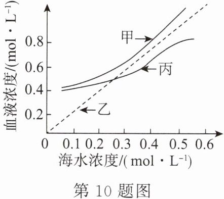 10. 如图所示为甲、乙、丙三种海蟹在其他环境条件一定,不断改变海水浓度时,血液浓度的变化情况(已知海水的正常浓度约为 $ 0.5\ mol · L^{-1} $)。下列叙述中,错误的是 ( )