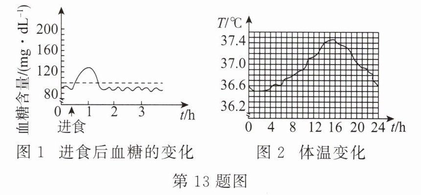 13. 在航天飞机的飞行过程中,地面指挥中心对航天员的生理状况进行了实时监测。表中所示为其体内相关液体的 $ pH $,图 1、图 2 分别表示进食后血糖含量变化情况和体温变化情况。请回答下列问题: