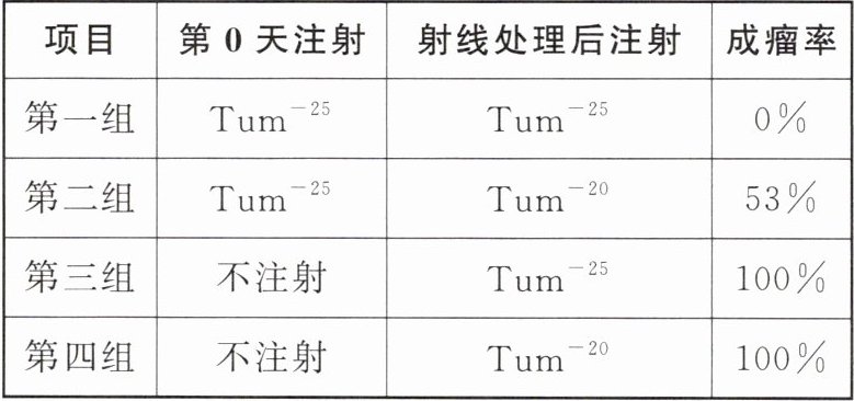 (1)①第一组的成瘤率为0,合理的解释是第一次注射的Tum⁻²⁵作为________刺激机体产生了大量的效应细胞毒性T细胞和__________________,射线处理后保留下来的少数细胞,在第二次注射Tum⁻²⁵时,能迅速增殖分化并将Tum⁻²⁵清除。