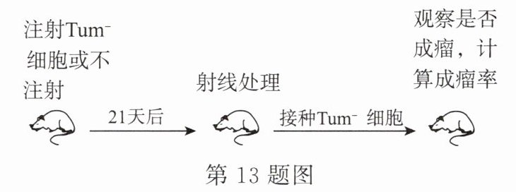 13. 癌症是人类面临的最大健康挑战之一,科学家一直致力于抗击癌症的研究。将畸胎瘤细胞(Tum⁺)注射到小鼠体内会导致肿瘤的产生。通过诱变,研究者获得了多个成瘤率很低的畸胎瘤细胞株(如Tum⁻²⁰、Tum⁻²⁵)。给小鼠注射Tum⁻细胞,21天后用射线处理小鼠(可杀死大部分淋巴细胞)并接种Tum⁻细胞,检测成瘤率(成瘤小鼠/注射小鼠),过程与结果如图表所示。请回答下列问题: