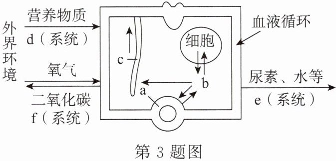 3.C 【解析】分析题图可知,a 是血浆,b 是组织液,c 是淋巴,d 是消化系统,e 是泌尿系统,f 是呼吸系统,D 正确;人体花粉过敏时,可能引起毛细血管壁的通透性增加,血浆蛋白渗出,从而导致血浆渗透压降低,水分由 a(血浆)流向 b(组织液),引起组织水肿,A 正确;某人一次摄入大量的食醋后不会引起内环境 pH 明显下降,原因是 a(血浆)内存在缓冲对,缓冲对中的碱性物质可与食醋反应,从而使 pH 基本不变,B 正确;在 a(血浆)、b(组织液)、c(淋巴)三种液体中,a(血浆)中的蛋白质含量最多,C 错误。