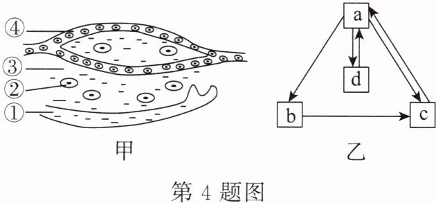 4.D 【解析】图甲中①淋巴,②为细胞内液,③为组织液,④为血浆,图乙中 a 为组织液,b 为淋巴,c 为血浆,d 为细胞内液,A 错误;淋巴管和血管之间在锁骨下静脉处直接相通,淋巴循环受阻会引起组织水肿,B 错误;细胞外液渗透压主要来源于 Na⁺ 和 Cl⁻,C 错误;氧气由血浆扩散到组织液,而二氧化碳则由组织液扩散到血浆,故图甲中③④处的氧分压和二氧化碳分压大小关系应该分别是③<④和③>④,D 正确。
