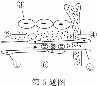 5.A 【解析】由图可知,图中①为毛细血管壁细胞,其生活的具体内环境是⑤血浆和②组织液,A 错误;由图可知,③为组织细胞,②为组织液,CO₂ 由组织细胞产生,从组织细胞经内环境排出体外,且由高浓度往低浓度运输,所以,CO₂ 浓度大小关系是③>②,B 正确;皮肤烫伤后,出现的水疱内液体主要是②(组织液),C 正确;图中④是淋巴,⑤是血浆,淋巴中的大分子可以流入血浆,D 正确。