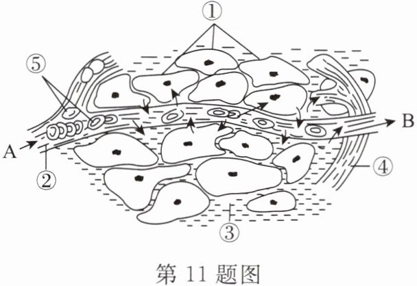 (4)由题图可知,血液流动的方向是 A→B,因此与 A 端相比,B 端 O₂、营养物质等减少,而 CO₂、尿素等代谢产物增多。