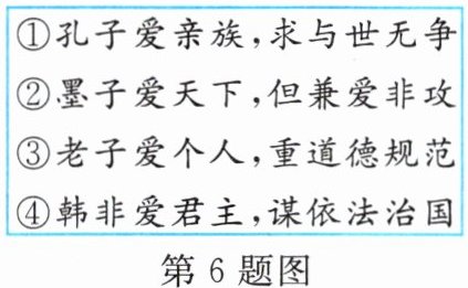 6. 七年级(1)班的同学们开展“百家争鸣”的项目化学习,他们以诸子百家对“爱”的理解为主题整理了如下笔记。其中正确的有 ( )