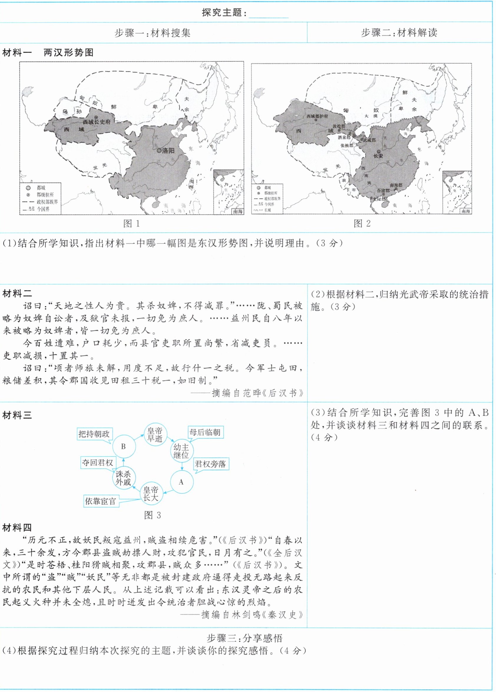 (4)(4分)主题:东汉的兴衰(2分) 感悟:统治者要注重发展生产,缓和阶级矛盾,关注百姓的需求。(2分,其他答案言之有理亦可)