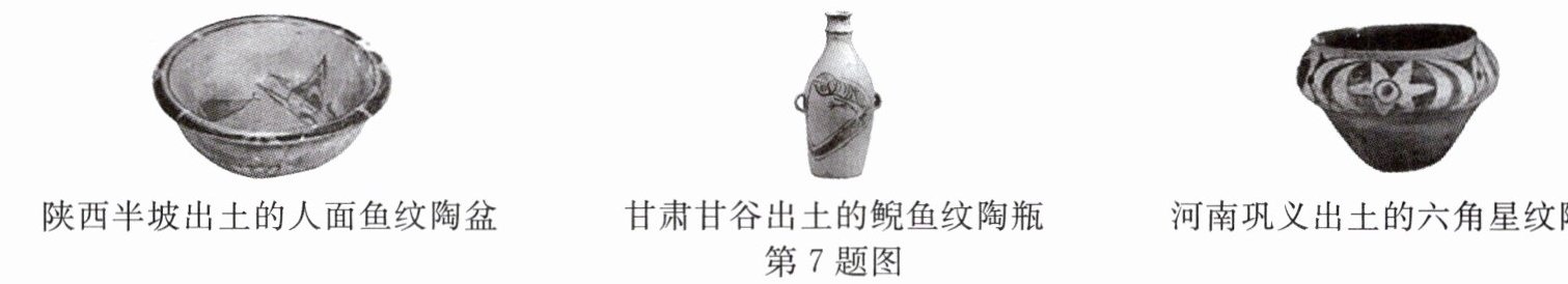 7. 仰韶文化的重要特征是制作彩陶。其施彩的陶器有盆、钵、瓶、罐等,图案包括鱼、鸟、花、太阳、星辰和几何纹样等。下列陶器的器物造型和图案设计可以共同印证我国原始居民( )
