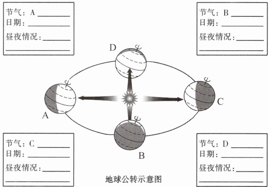 在图中适当位置补充地球自转、公转的方向,分别描出二分二至日太阳直射的纬线,并将图中方框内的内容填写完整。(注意:均只考虑北半球情况)