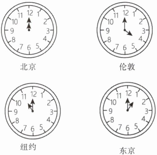 1. 生活情境 小红在北京火车站看见大厅四个城市的时钟(如图),在同一时刻时间不同的原因是( )