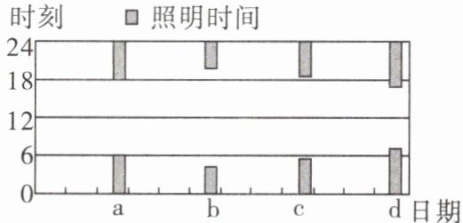 5. 生活情境 细心的小明同学发现湖南路灯开闭的时间会随着季节发生变化,下图是湖南二分二至日路灯照明时间图,图中 b 代表的日期可能是( )