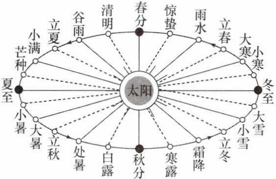 生活情境 冬至是二十四节气中第二十二个节气,也是入冬后的第四个节气,通常出现在公历每年的 12 月 22 日前后,它是天文意义上冬天的开始。读二十四节气示意图(二分二至日均指北半球),完成 3~4 题。